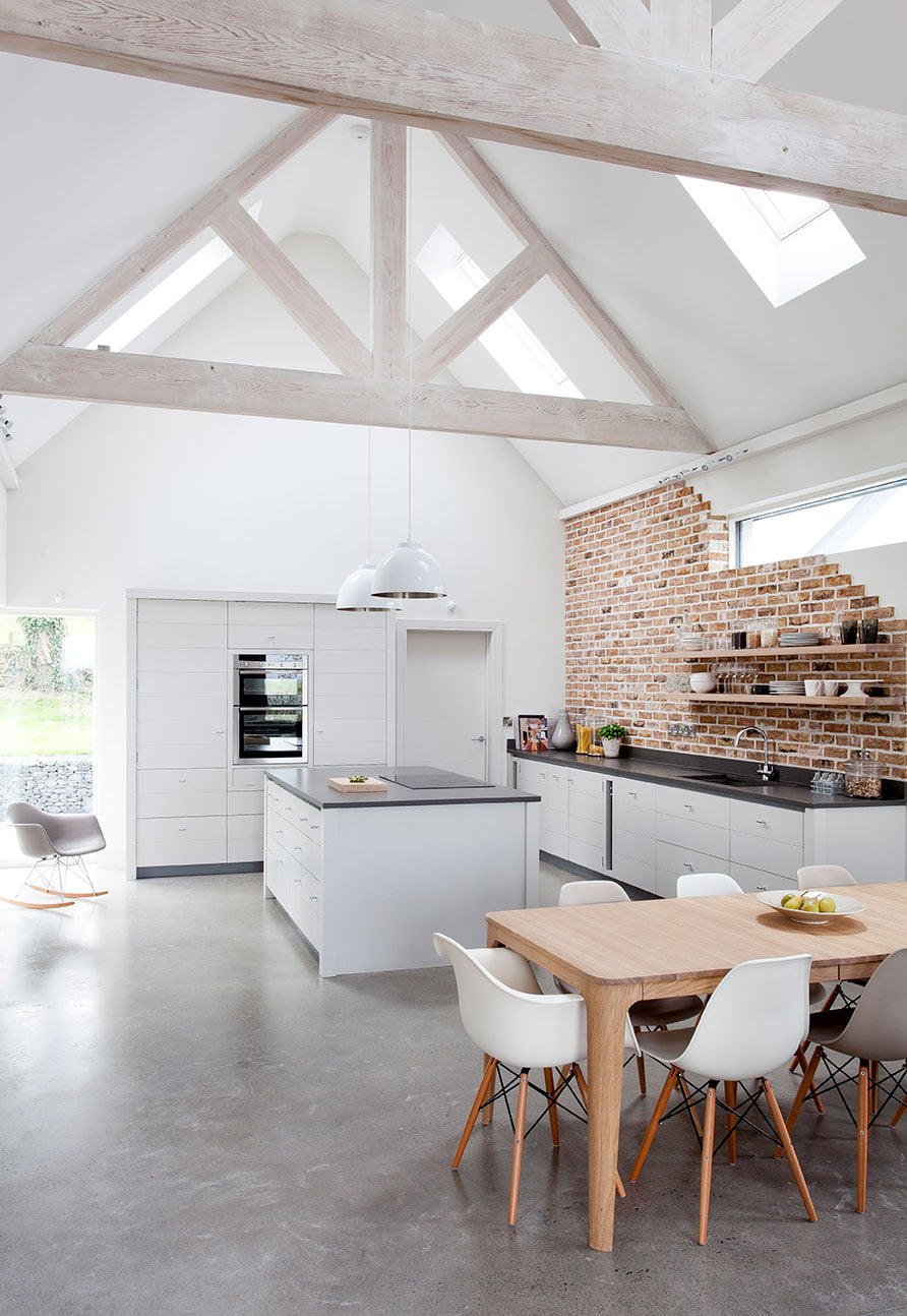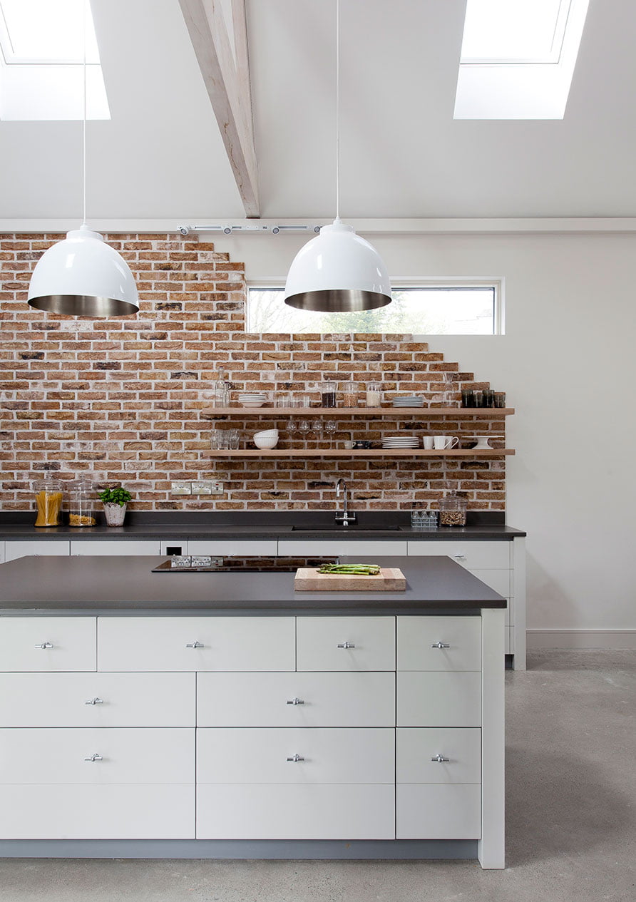 Geri continued with the concept of a contemporary space by adding bare brick slips behind the kitchen and distinctive Neptune Byron pendant lamps above the island. Tara also required contemporary seating in the lounge area, so Geri designed a striking L-shaped sofa in Smoky Grey.