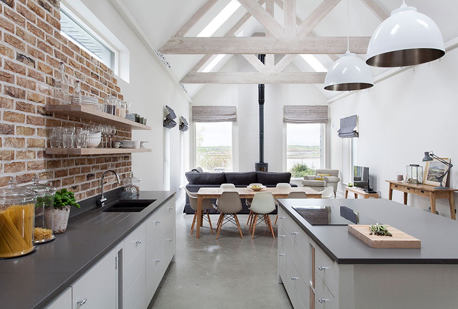 Brief: To create a modern space in their new-build, including kitchen, lighting and furniture. The client wanted something contemporary and clean that would suit the polished concrete floors, high vaulted ceilings and stunning coastal views.