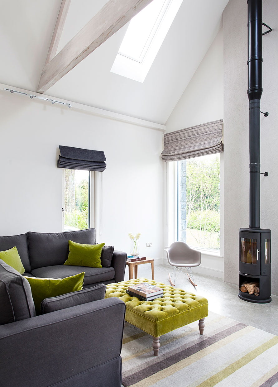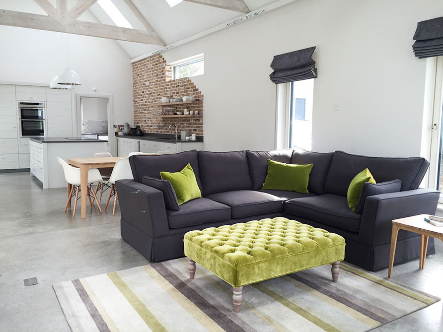 “We chose the smoky grey upholstery on the sofa to help eliminate grubby fingerprints as well as to create a clear separation of usage in this open plan space. We then chose the lime velvet for the deep buttoned ottoman to bring a touch of luxury to the room.