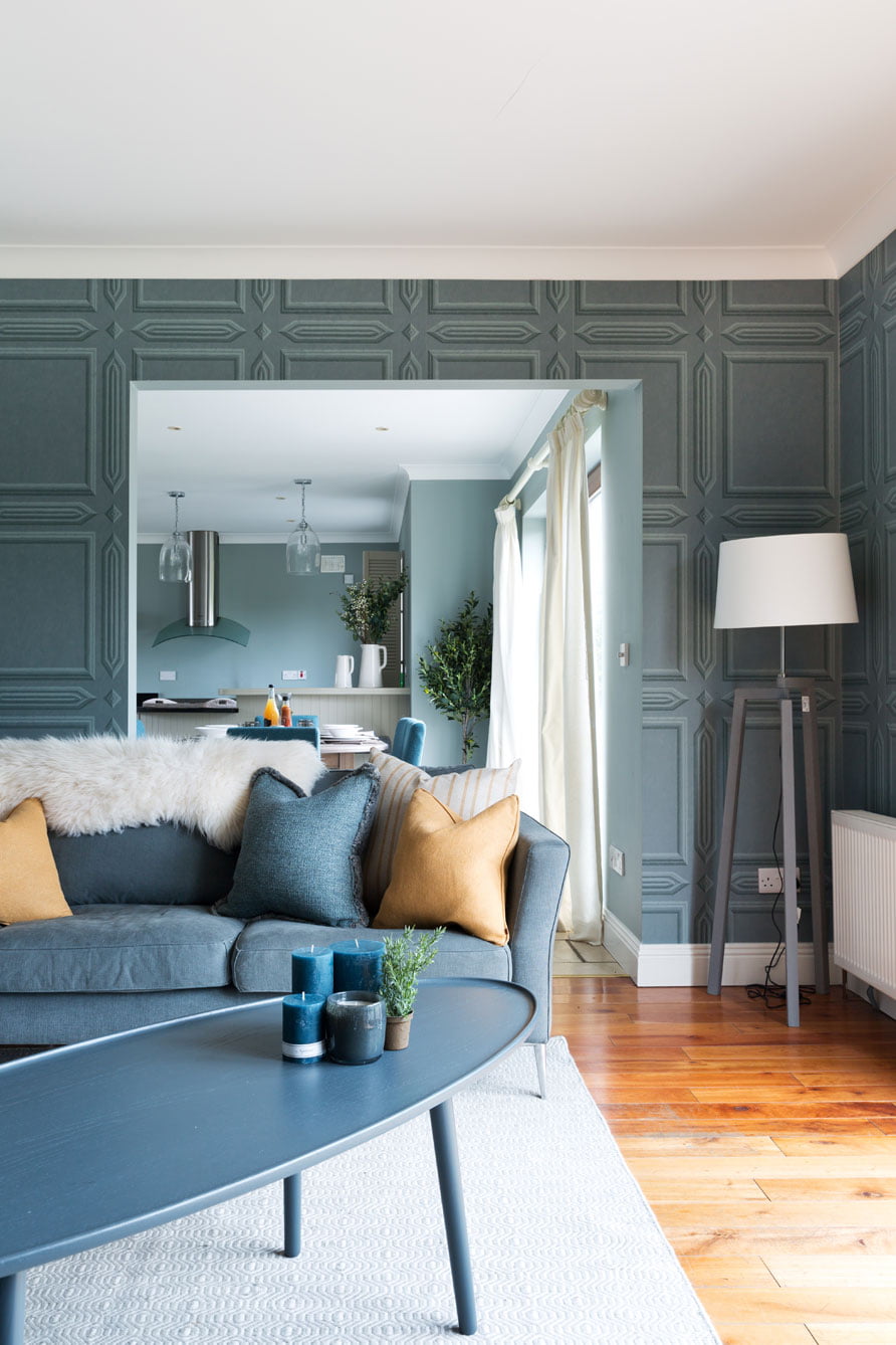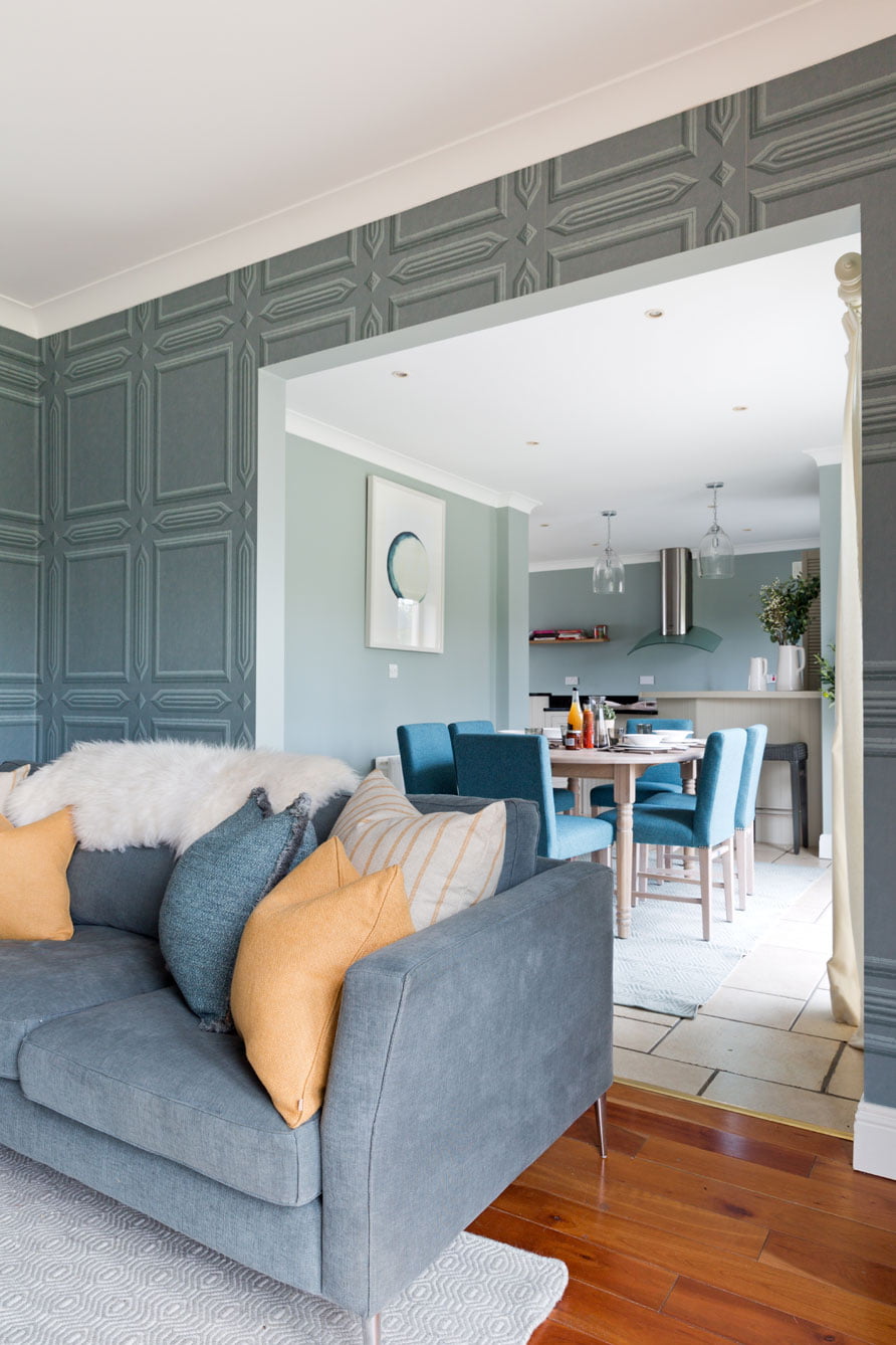 Following through the dining room from the kitchen you arrive at the sitting room, a multi-functional space: for watching movies, reading or relaxing to name but a few. To create the feeling of warmth in the space, Geri opted for a darker shade on the walls while also injecting a little whimsy with the trompe l’oeil panelled wallpaper from Little Greene. This proved to be the perfect backdrop for the more streamlined, minimal furniture chosen for the space, namely the Swedish designed SITS sofa in a cosy grey linen and the striking minimalist armchair.