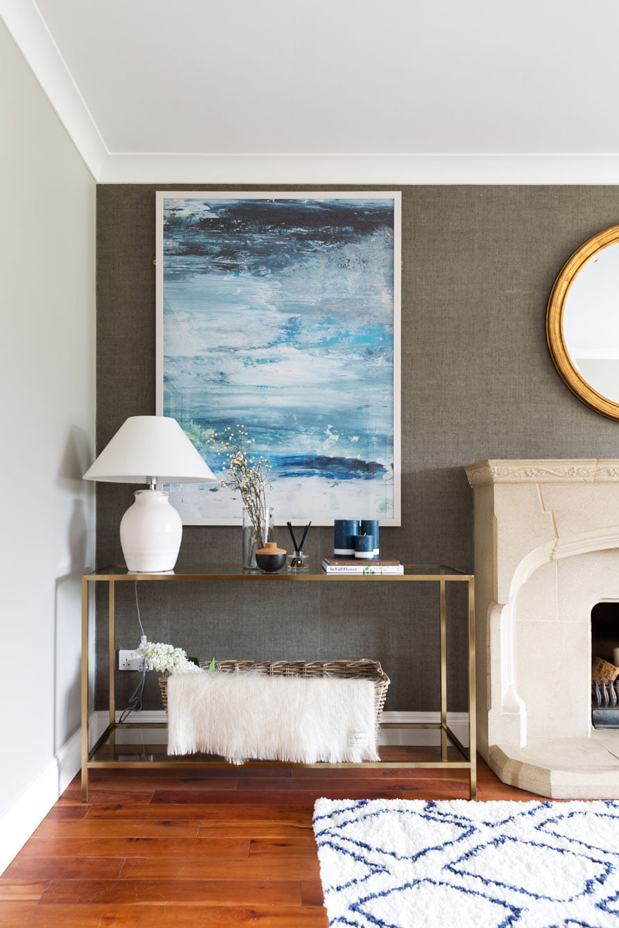 First, Geri selected the backdrop for the space, a wallpaper from the Grasscloth collection by Thibaut, a range of wallpapers integrating natural fibres to create a subtle textured finish. Then two three-seater SITS sofas were chosen, the Impulse design upholstered in a neutral linen. Next, two brushed brass Keswick console tables by Neptune were placed on either side of the chimney breast, the glazed tops contributing to the less-is-more mantra of this particular interior. A deep pile Calvin Klien rug was selected, featuring a large scale geometric pattern, the only concession to this minimalist space.