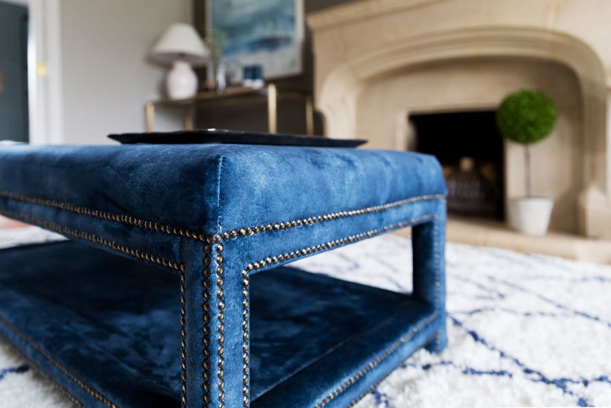 To finish the space and give it an extra level of personalisation, Geri designed a luxurious ottoman in a rich navy velvet, trimmed with brass studding. The large scale prints were made exclusively from a series of originals Geri found and framed locally, an inexpensive way to guarantee a uniquely finished space, without the cost of buying original art.