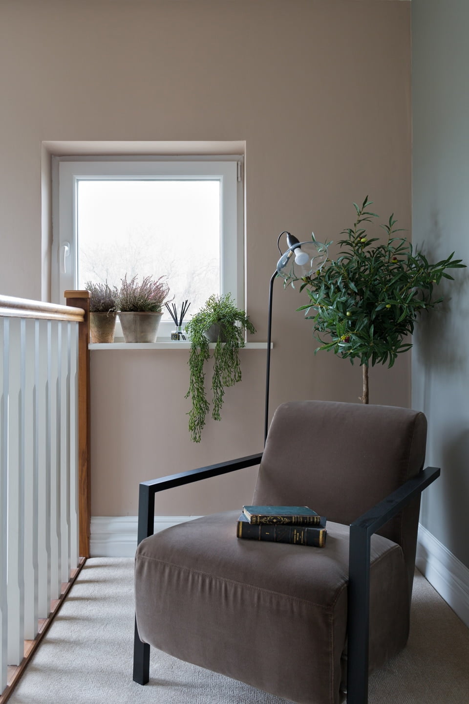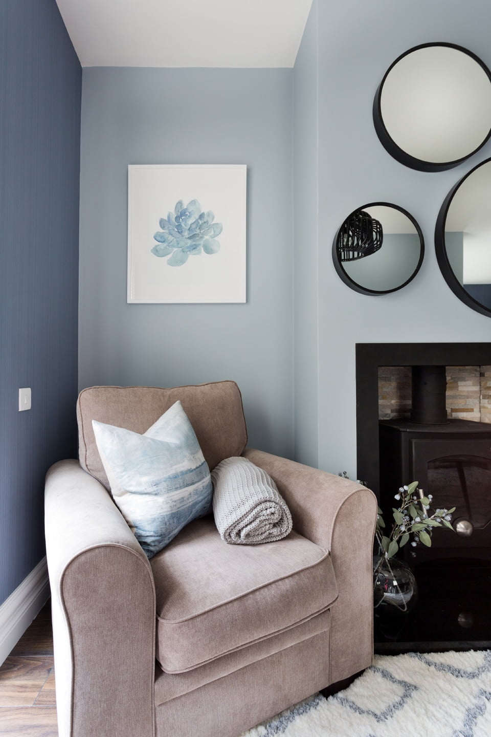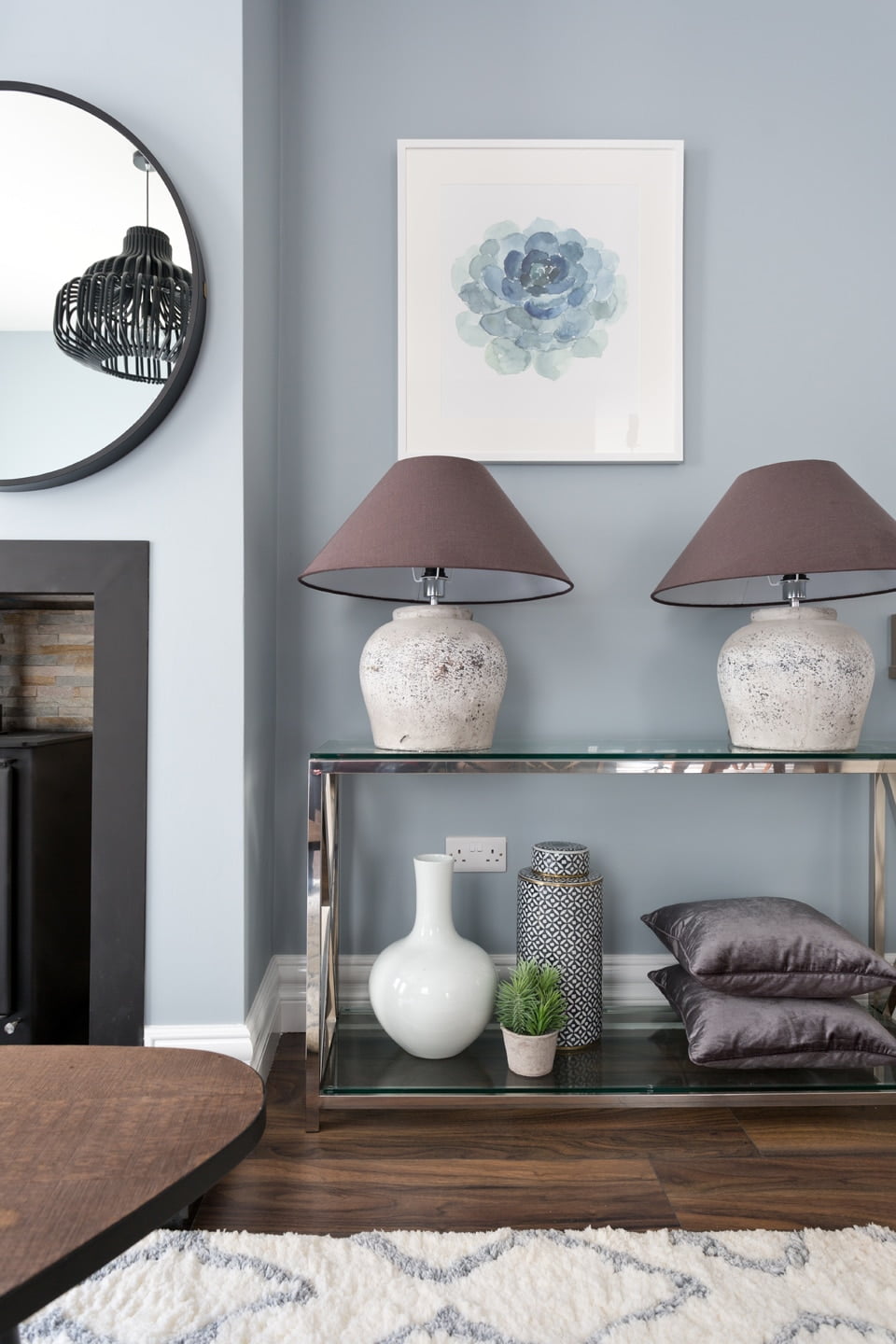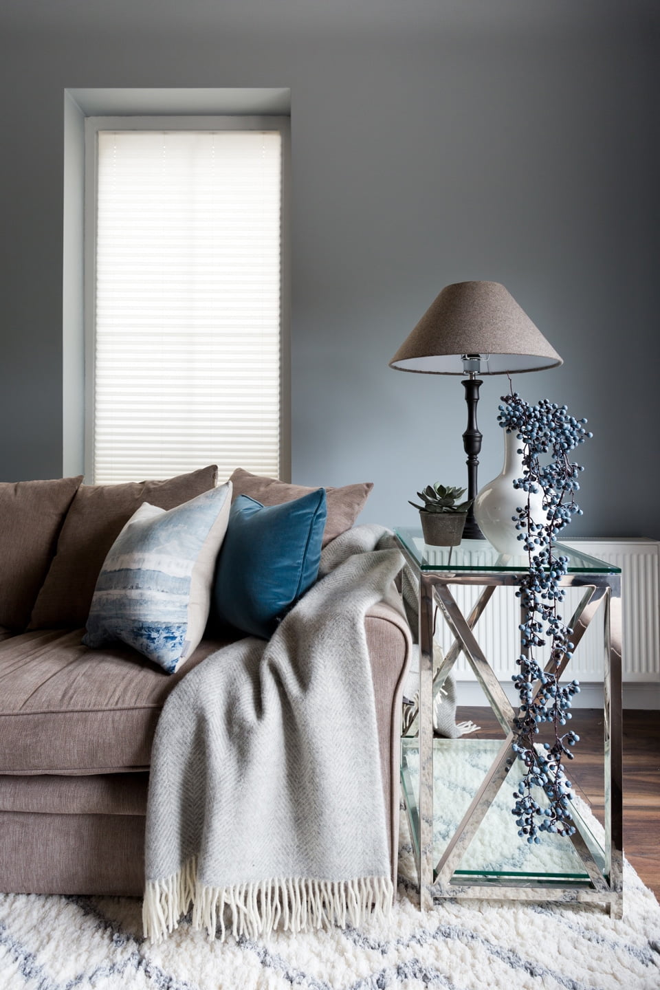 I started with the existing sofa as it was quite a striking mauve colour. Working with this in mind I chose a palette of tonal shades: blues, purples and natural tones. By working within this tonal family – with a touch of contrast in the greenery and chrome finishes – and considering a lighting plan from the start, I was able to create a welcoming and modern interior without the rough edges of a new build. The addition of commissioned art, faux foliage, throws and other accessories helped turn this house into a sophisticated home for its owners.