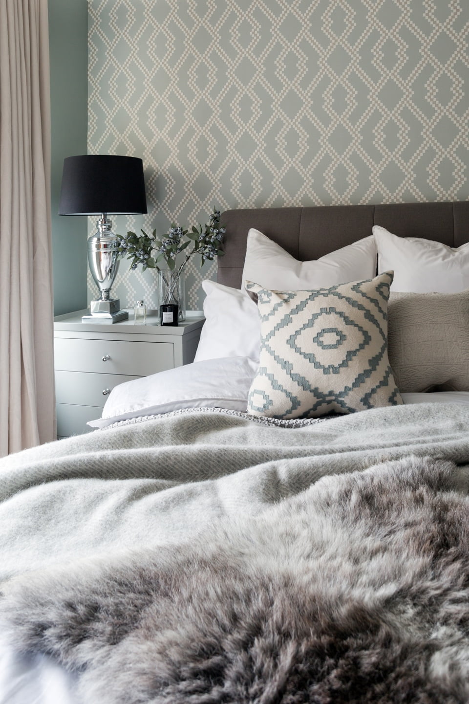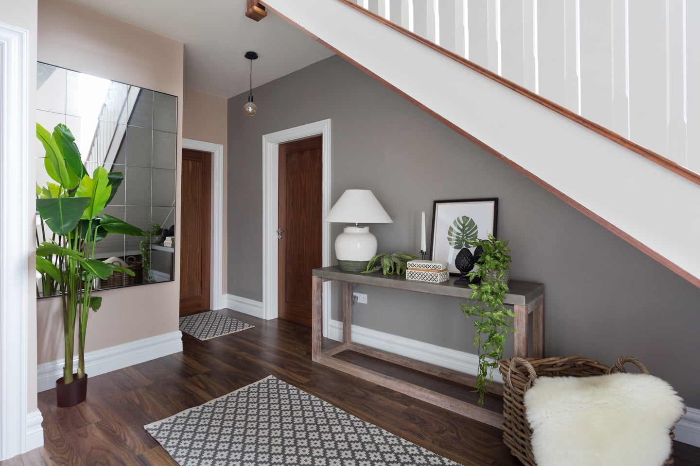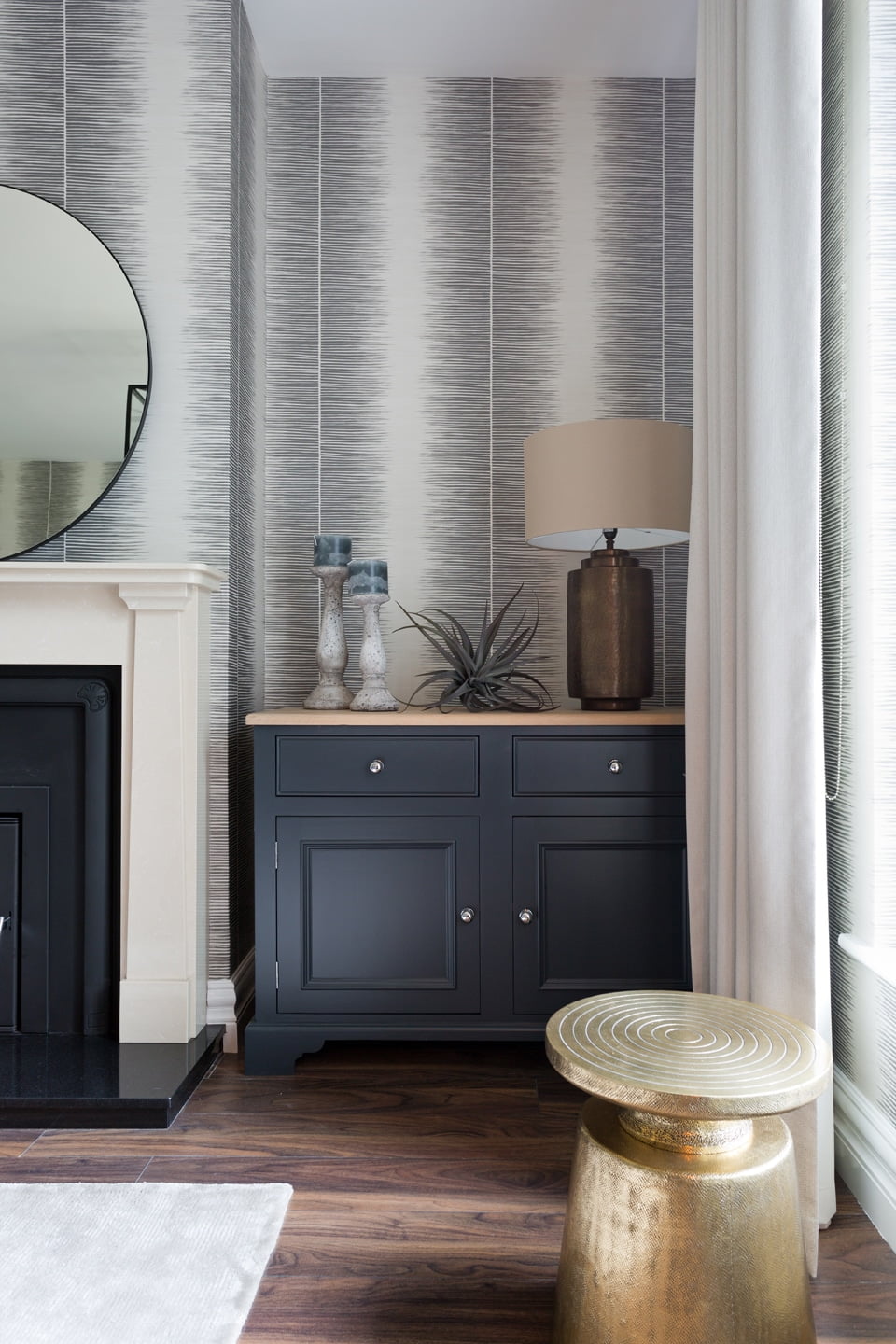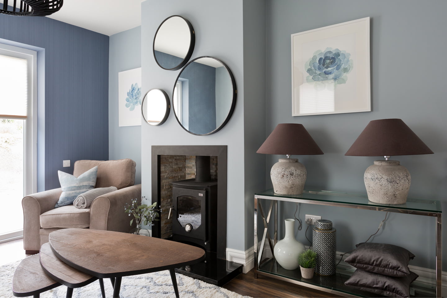 I started with the existing sofa as it was quite a striking mauve colour. Working with this in mind I chose a palette of tonal shades: blues, purples and natural tones. By working within this tonal family – with a touch of contrast in the greenery and chrome finishes – and considering a lighting plan from the start, I was able to create a welcoming and modern interior without the rough edges of a new build. The addition of commissioned art, faux foliage, throws and other accessories helped turn this house into a sophisticated home for its owners.