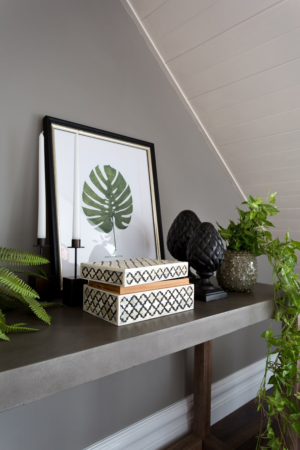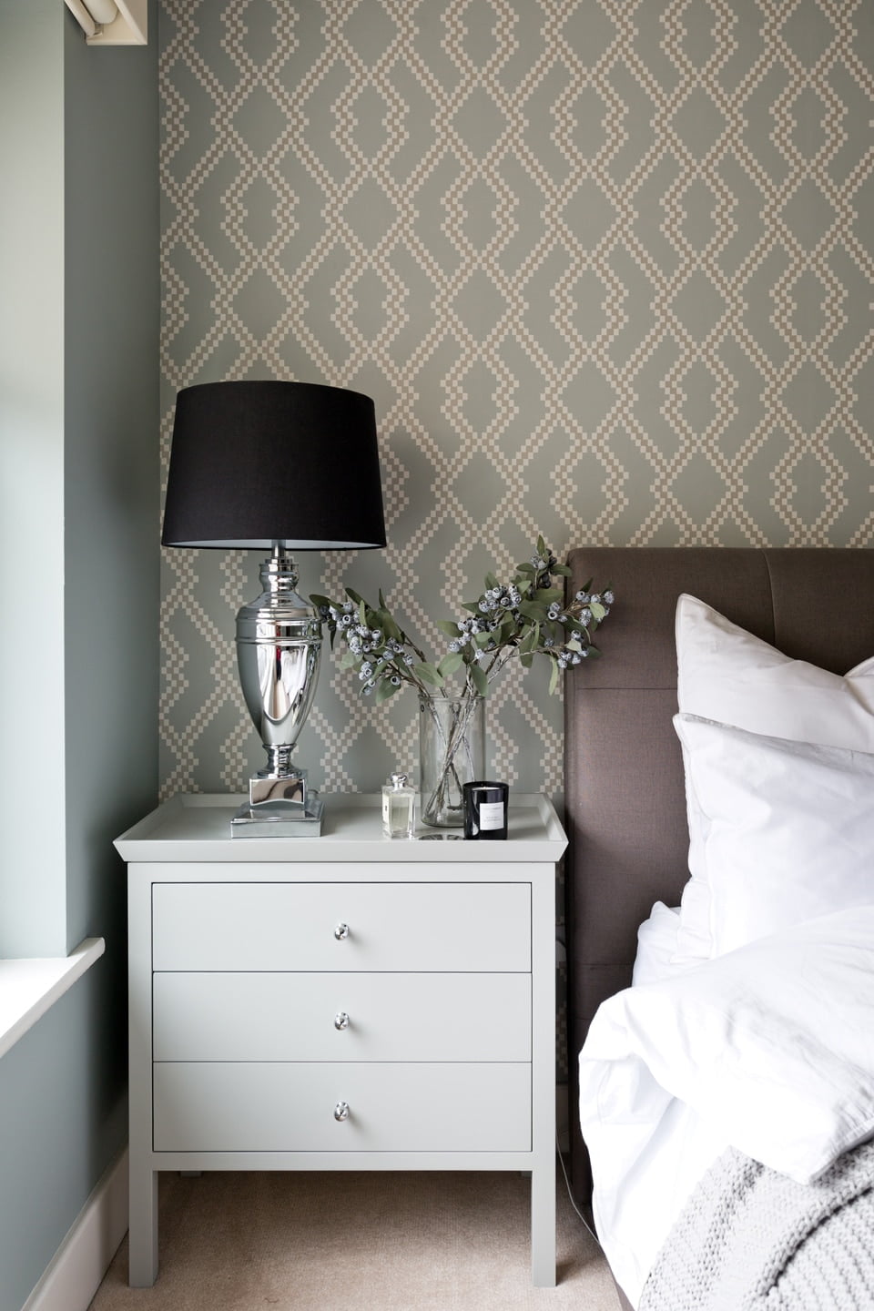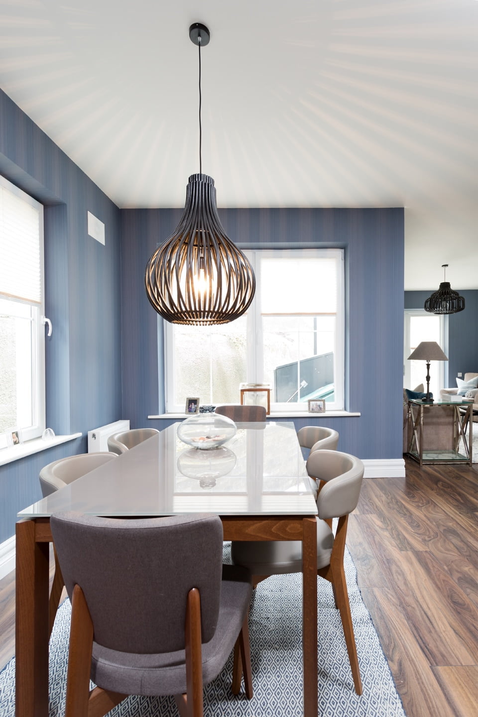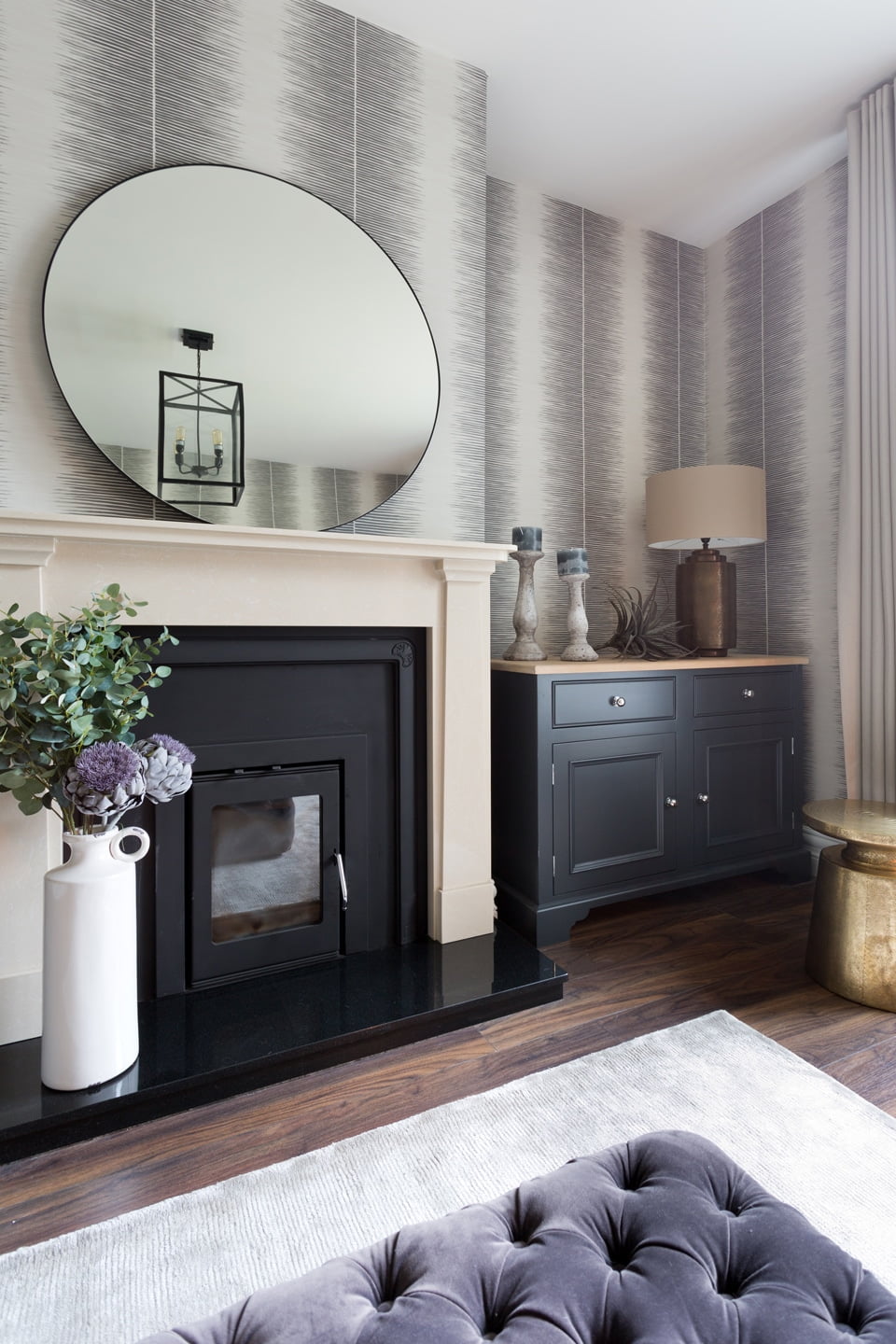 I started with the existing sofa as it was quite a striking mauve colour. Working with this in mind I chose a palette of tonal shades: blues, purples and natural tones. By working within this tonal family – with a touch of contrast in the greenery and chrome finishes – and considering a lighting plan from the start, I was able to create a welcoming and modern interior without the rough edges of a new build. The addition of commissioned art, faux foliage, throws and other accessories helped turn this house into a sophisticated home for its owners.